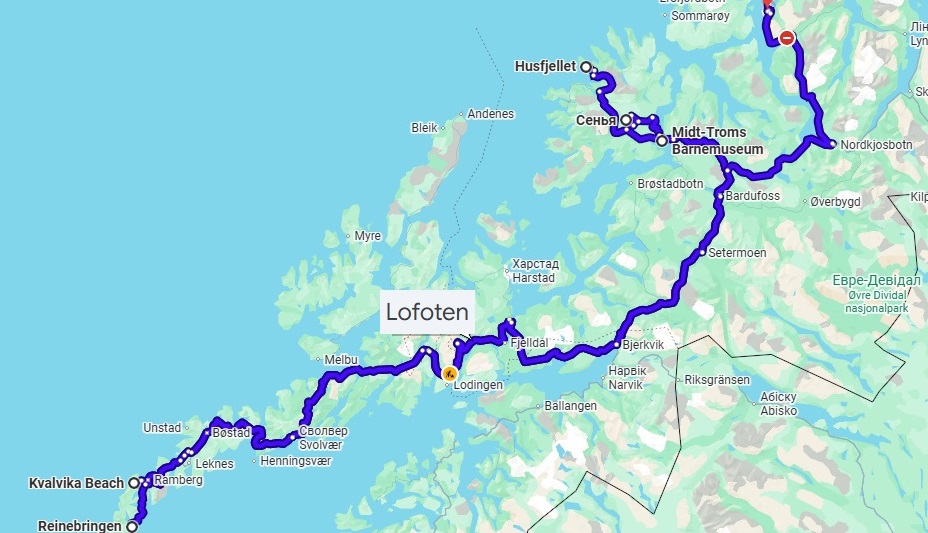 Тромсе - острів Сенья - гора Сегла - гора Husfjellet - гора Райнебрінген - рибацьке поселення А - гора Рутен - пляж Kvalvika - рибацьке поселення Хеннінгсвер - гора Himmeltindan - пляж Haukland - пляж Uttakleiv - гора Blatinden